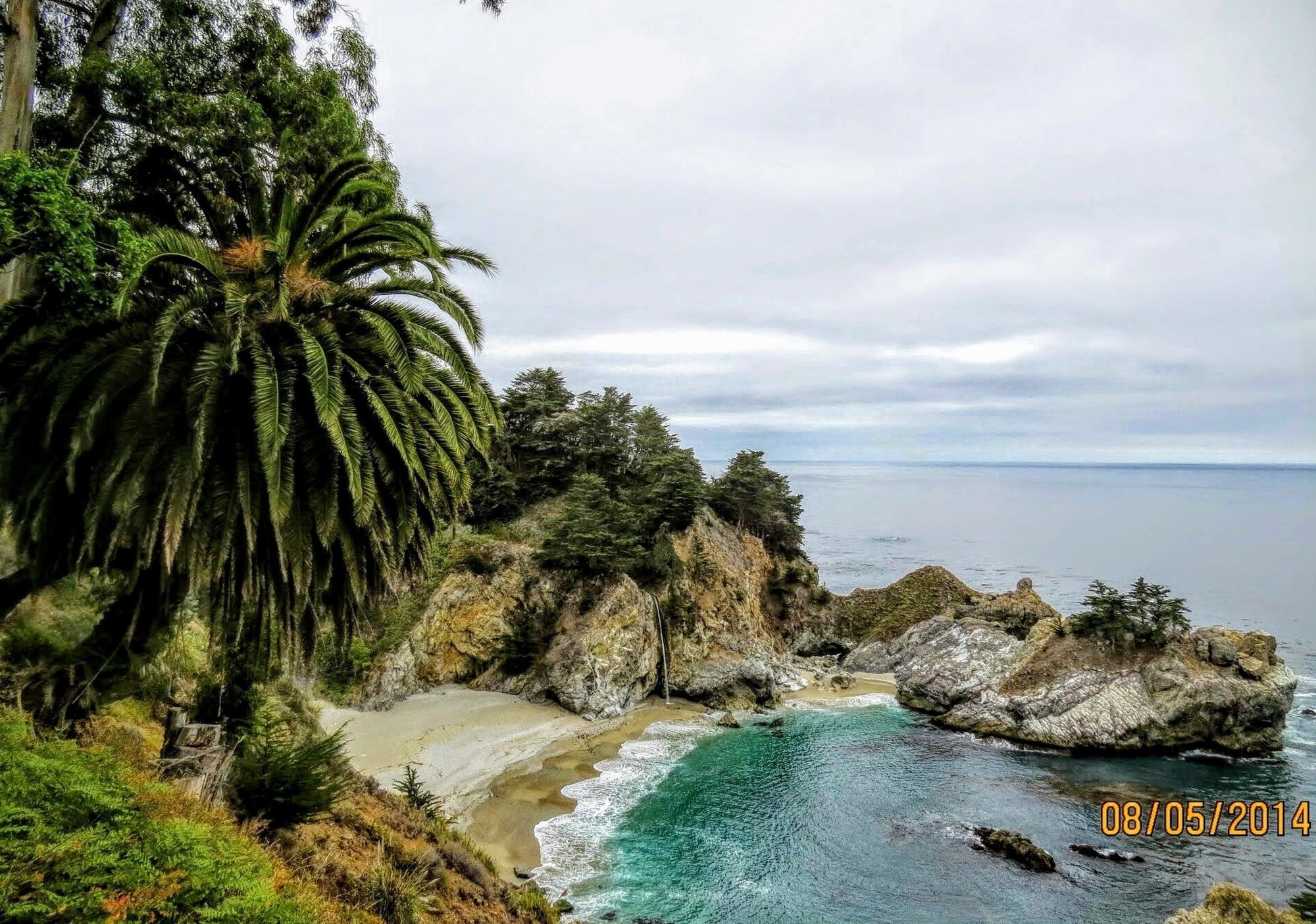 “McWay Falls trickles from the hill below the Pacific Coast Highway.”
