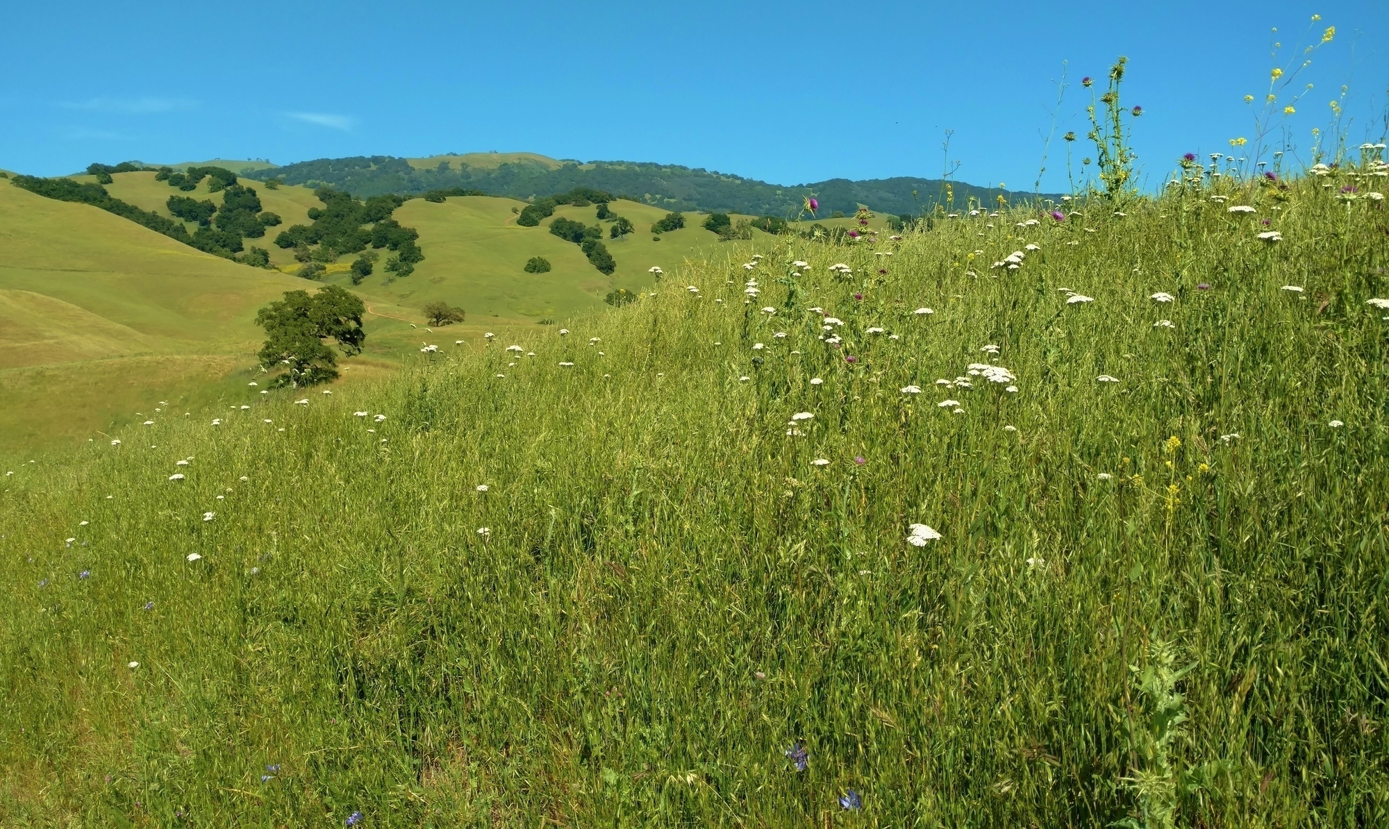 “White yarrow and other wildflowers - some bluish purple Ithuriels Spears, yellow mustard, and purple milk thistle, in the grass hills along Savannah Trail.”