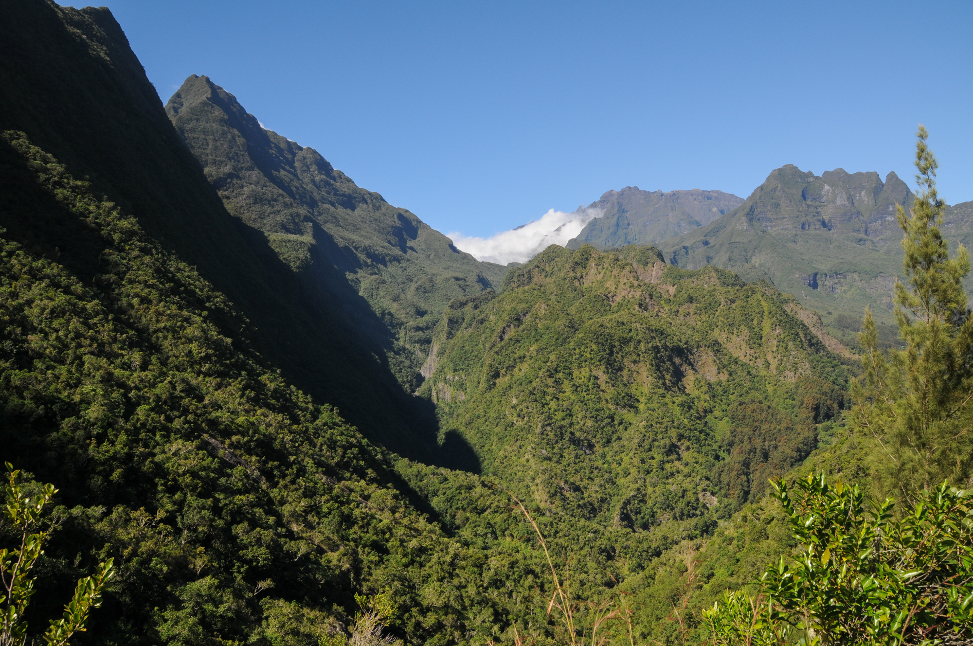 “The narrow ridge section of Sentier Augustave offers exceptional views to Le Cimendef and Piton des Neiges”