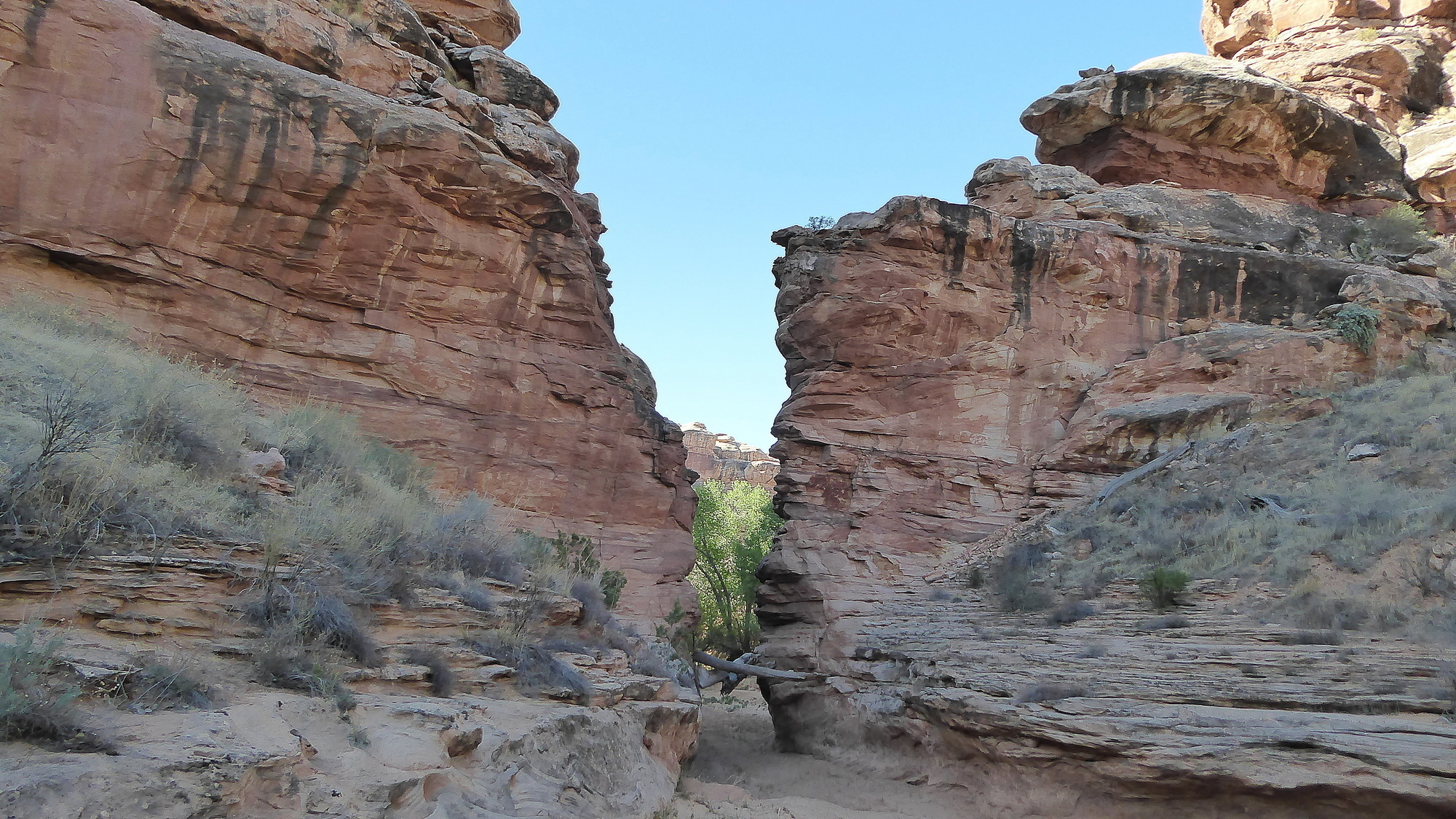 “The Narrows in Grand Gulch, looking downstream. About 1/3 mi downstream from the junction with Collins Cyn.”