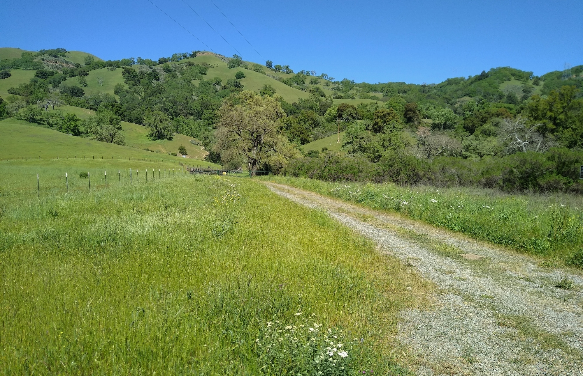 “Corral Trail disappears into the spring green, tree studded hills in Joseph D. Grant County Park.”