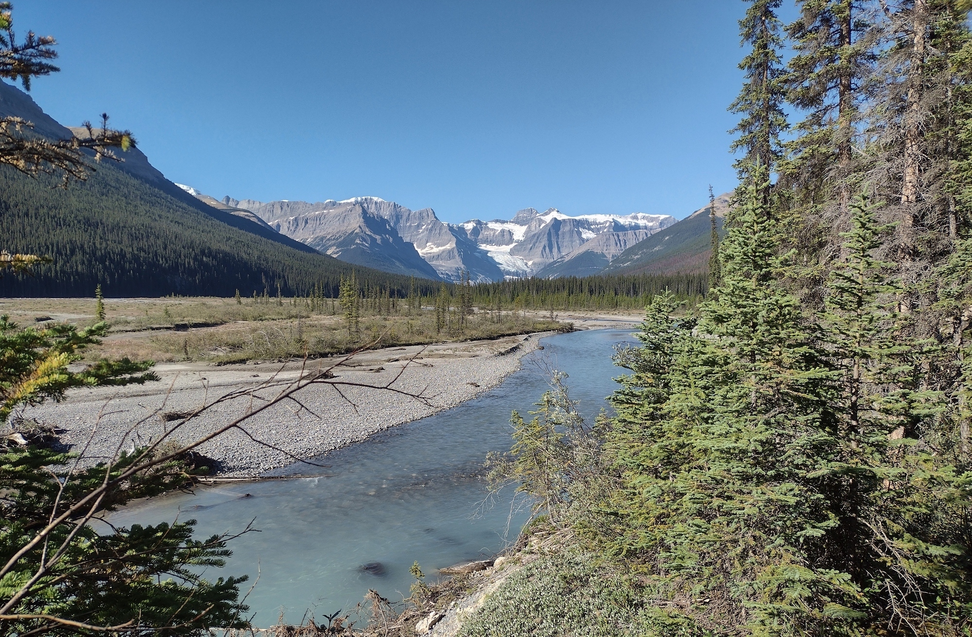 “A side channel of the Alexandra River below in the river's broad, flat valley. Mountains and the Alexandra Glaciers to the southwest, are in the distance. Zoom in for a close up look of the Great Divide.”