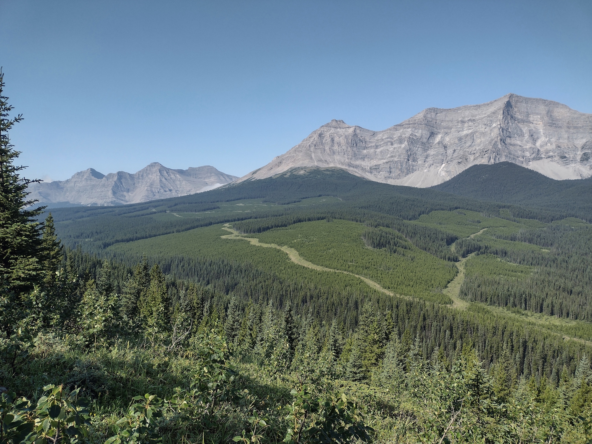 “Massive Mount Etherington, 9,439 ft., on the Great Divide, looms over forested valleys below. Seen looking southwest near Etherington Creek.”