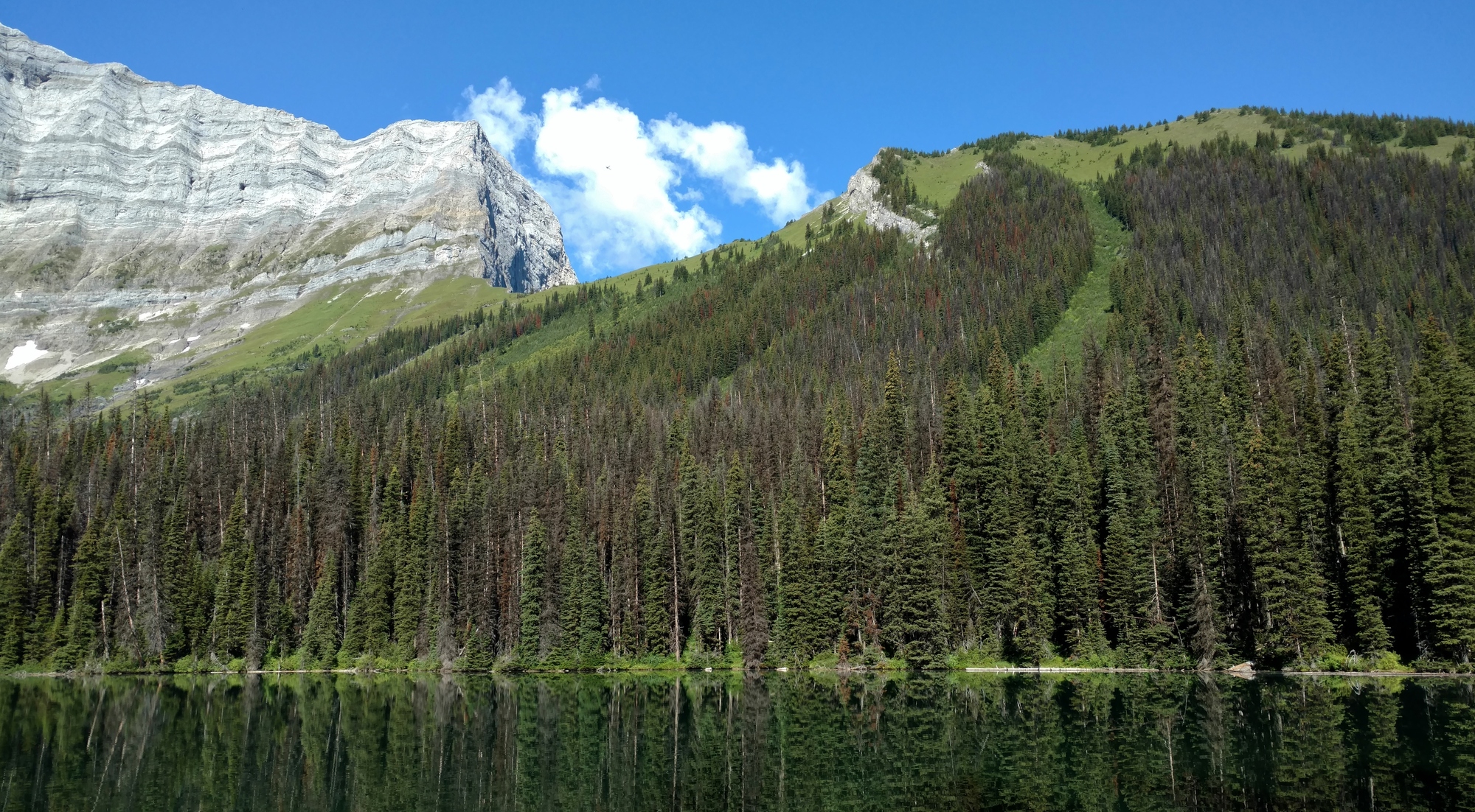 “Sarrail Ridge with its alpine meadows, overlooks the north side of Rawson Lake.”