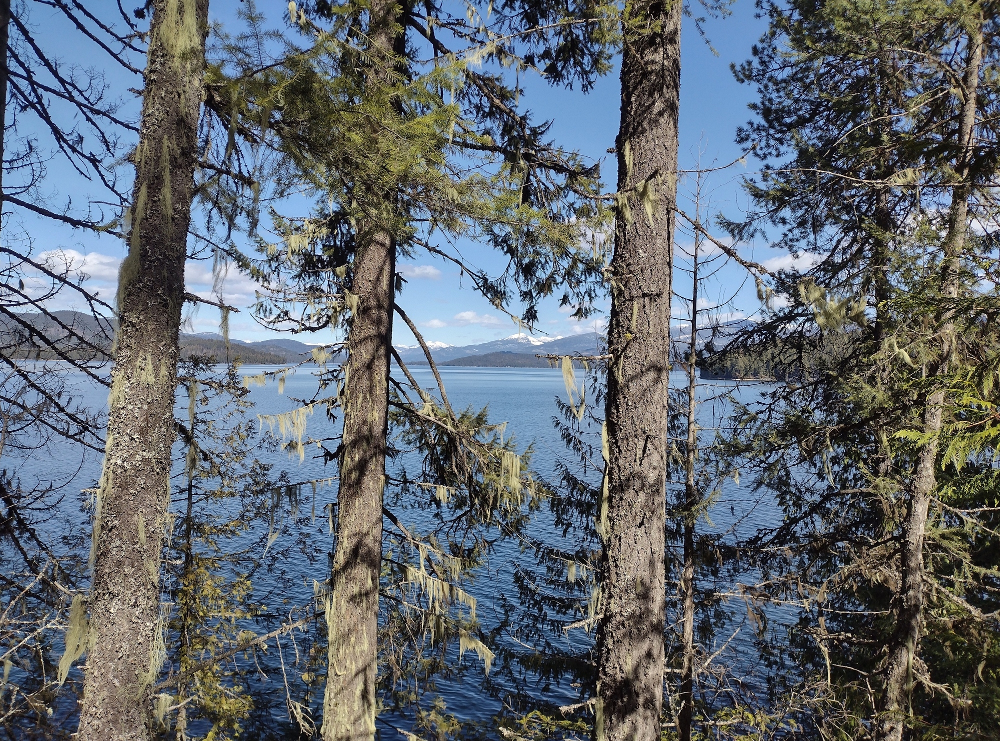 “Nice view through the trees, looking north up Priest Lake to its far end, and distant, snowy Selkirk Mountains.”