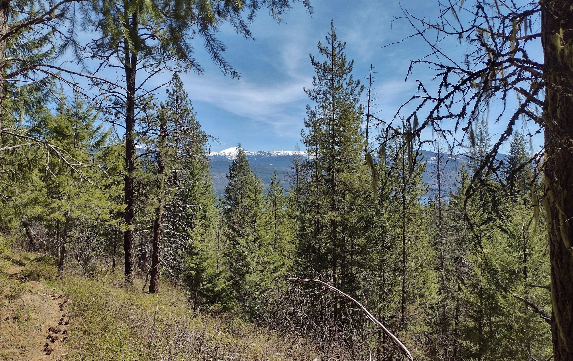 “Gunsight Peak (left center) and other Selkirk Mountains to the east, are seen from high on Kalispell - Reeder Bay Trail. A glimpse of Priest Lake (right) is also seen through the trees.”